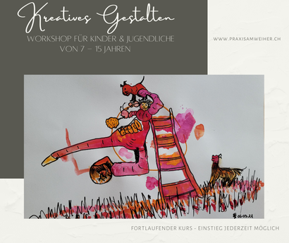 Malen, Zeichnen, Experimentieren, Illustrieren u.v.m. Inspiriert durch leuchtende Farben, Geschichten und fachkundige Begleitung entstehen kleine Kunst - Werke. Dieser Workshop macht Freude!